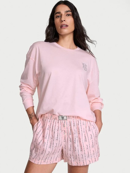 Pijama Feminino Rosa Manga Longa + Shorts Victorias Secret Tam G Algodão